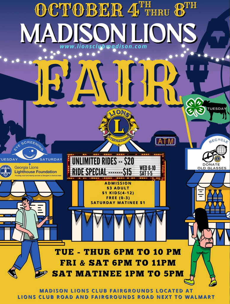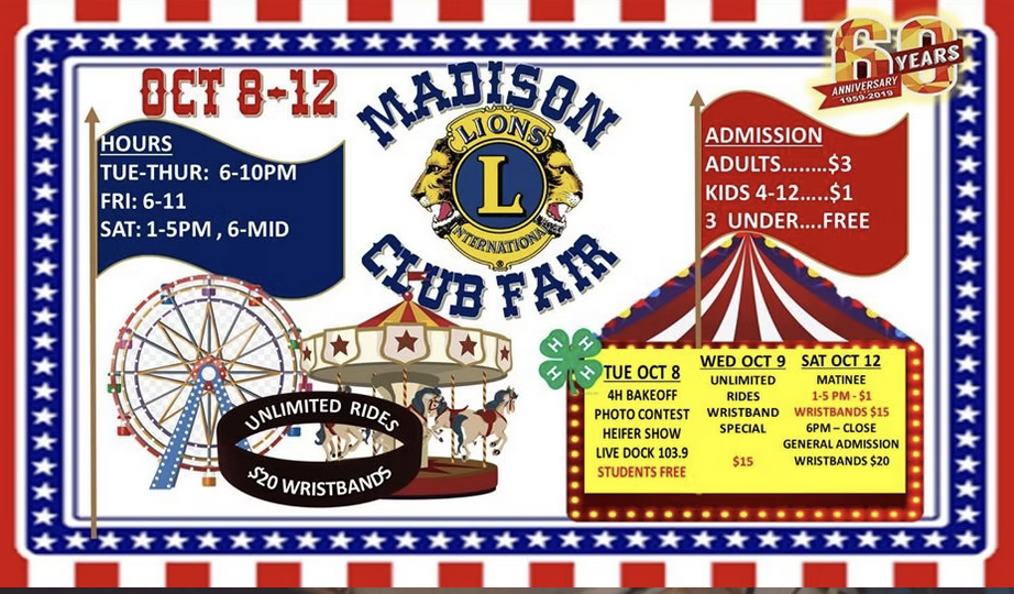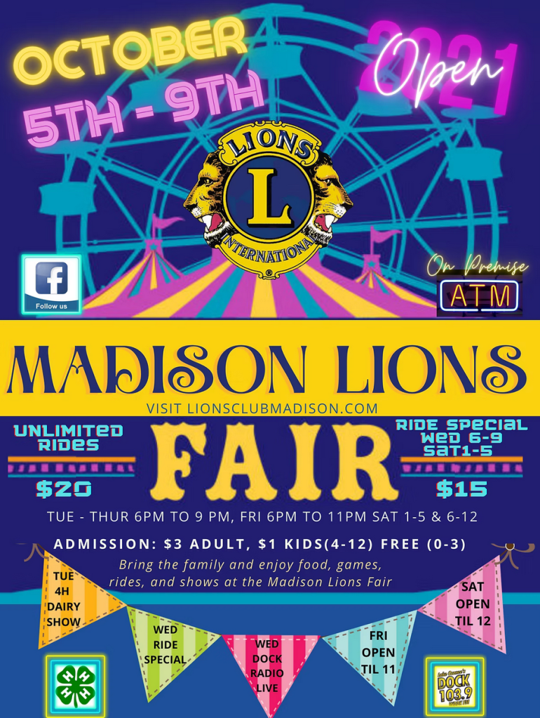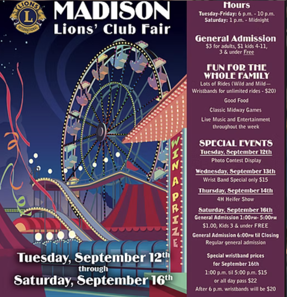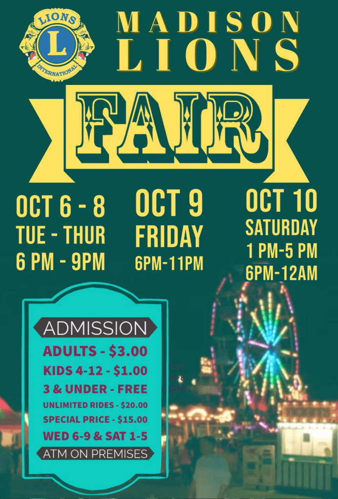 The 2026 Madison Lions Club Fair will be held October Wednesday 14- Saturday 17.